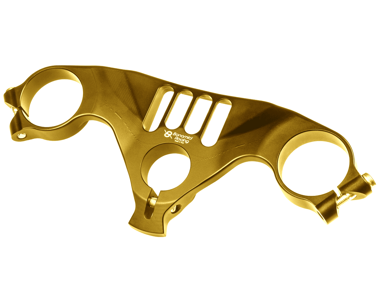 Bonamici Ducati Panigale V2 Top Triple Clamps are CNC machined for an exact fit over the stock diameter forks. Lightweight and strong at only 11.5oz, they resist flex under load, providing a more direct steering input and race feel. Used by several teams in World Superbike motorcycle racing. Anodized in Gold. Includes all necessary mounting hardware and screws.