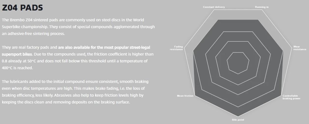 Brembo Z04 motorcycle front brake pads for trackdays and racing only. These motorcycle racing brake pads are exclusively developed for the highest levels of racing and have been designed to give top performance in extreme braking situations. The main features are high braking control, stability and stopping power. They are highly resistant to brake fade and have a long-lasting compound due to their special sintered compound agglomerated through an adhesive-free process. The friction coefficient is higher than 0.8 at 50°C and does not fall below until a temperature of 400°C is reached. The pads easily bed to the disc in just a few laps.*1/card per caliper (bikes with dual calipers will require 2 cards).